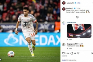 体育资讯3月15日讯 德甲第26轮,拜仁1-1战平勒沃库森。赛后,拜仁边锋路易斯·迪亚斯在社交媒体发文,鼓励球队。
