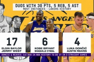 东契奇和里夫斯连续三场同场30+5+5 历史首对队友