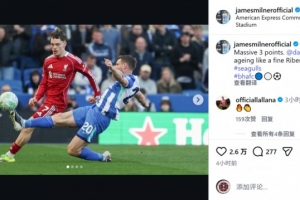 布莱顿中场米尔纳赛后在社交媒体上写道:“非常重要的三分,维尔贝克,年龄就像一瓶陈年佳酿(Ribena黑加仑果汁,含调侃意味),越老越香。”