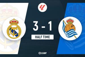 上半场补时4分钟。半场战罢,皇马3-1皇社。